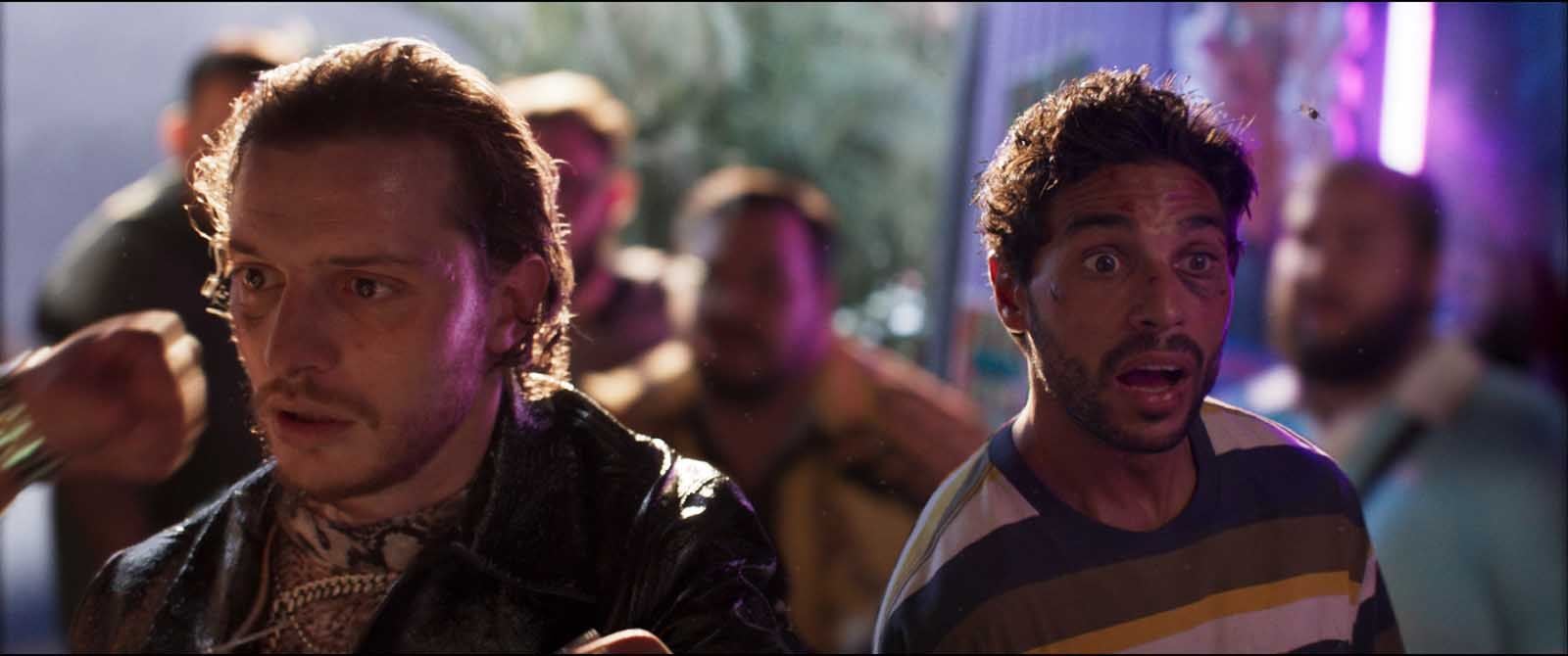 Réalisé par Julien Royal (oui, le fils de), Bagarre est sa troisième collaboration avec Nassim Lyes après En Passant Pecho et Nouveaux Riches (tous les deux dispos sur Netflix). Les deux bougres, qui ont co-écrit le scénario, mise une grande partie de leurs billes sur le personnage principal : belle gueule, bagarreur mais complètement débile, trop gentil pour l’univers dans lequel il gravite et complètement 1er degré. Lyes s’amuse beaucoup avec, d’autant qu’il évolue dans un monde absurde, où tous les curseurs sont poussés au maximum.