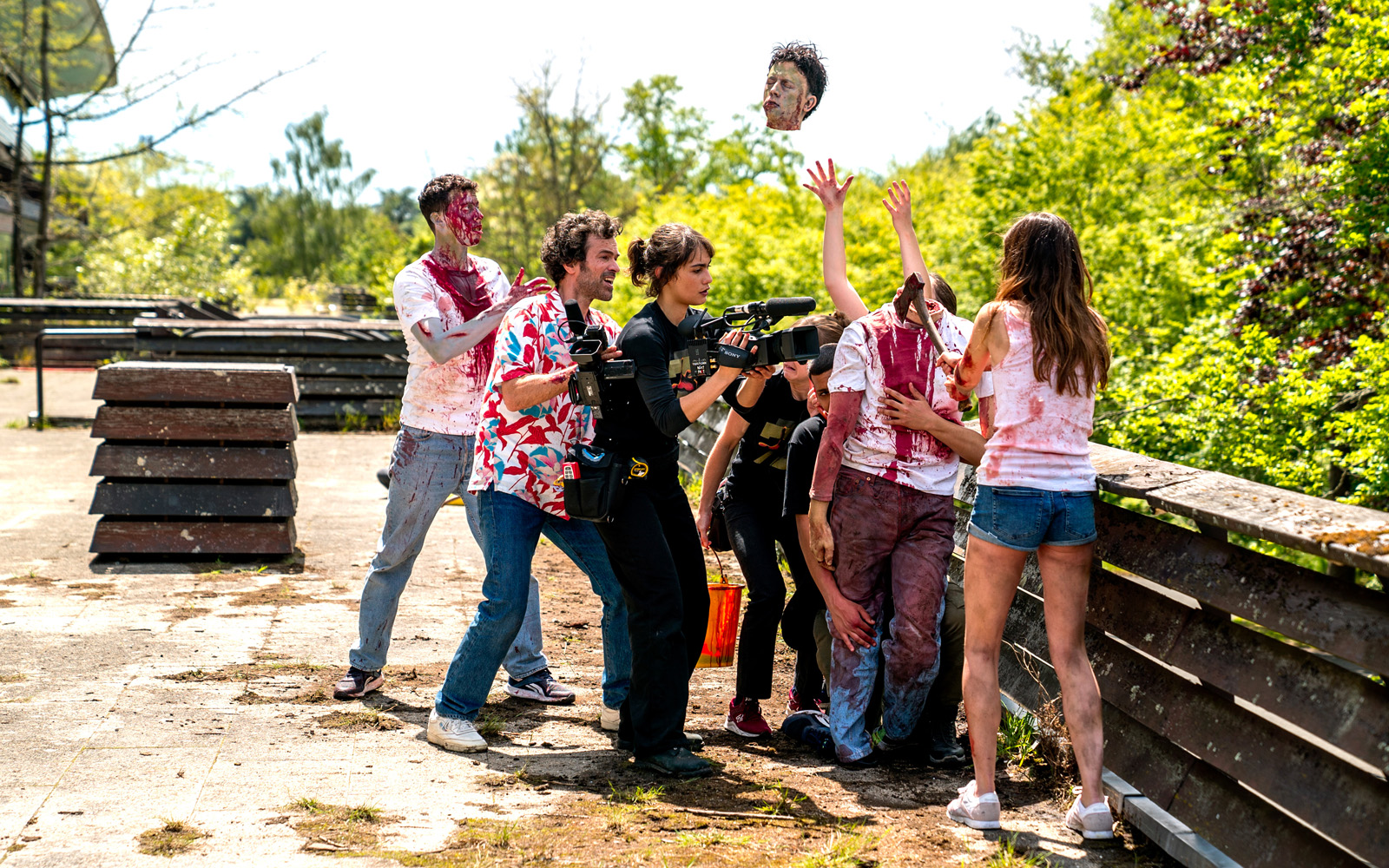 La première partie est joliment réussie, drôle et malgré le coté débile des personnages, ils parviennent à être attachant, au point qu’on en oublie parfois qu’il s’agisse d’un tournage (vous suivez ?) et qu’on se prenne au jeu. On y sent planer l’ombre du film japonais, certaines séquences semblant sorties d’une production nipponne un peu trop hystérique. Mais c’est vraiment le dernier acte, le tournage, où l’on voit un mélange de plans hyper saturés en couleurs et d’autres plus légers du tournage, qui est réussi. Le rythme est formidable, les gags parfois sous la ceinture très réussis. Et ca donne au film une jolie montée en puissance.