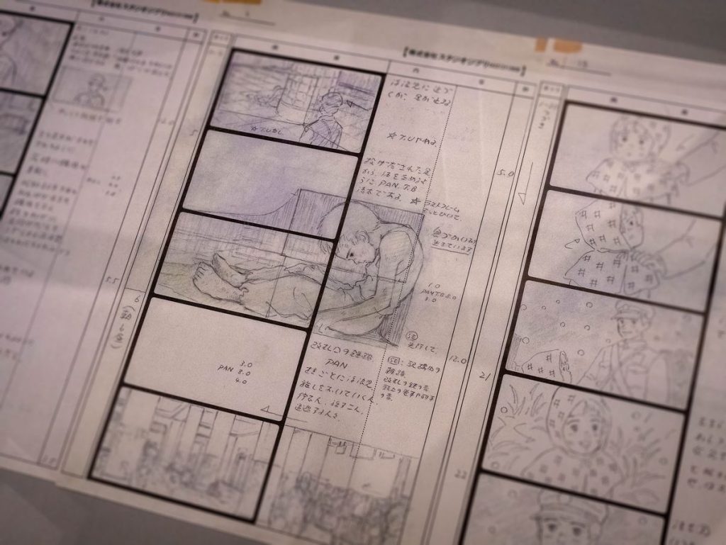 L’exposition se déroule chronologiquement : ses débuts avec Horus Prince du Soleil, ses travaux dans l’univers de la série dont la réalisation de tous les épisodes de Heidi, de Anne & la Maison aux Pignons Verts (ré-adaptée en live pour Netflix sous le titre « Anne with an E ») ou encore des deux moyens métrages Panda Petit Panda. On peut découvrir de nombreux documents manuscrits (malheureusement pas traduits du japonais) et encore plus de travaux préparatoires : storyboards, layouts, celluloïdes et dessins en tout genre. Takahata travaillant en équipe, la plupart des travaux visuels sont signés d’autres que lui, dont un certain Hayao Miyazaki. On s’arrête ensuite longuement sur le Tombeau des Lucioles pour enchainer sur les différentes productions long métrage pour finir sur Kaguya, le film sur lequel il a préféré travailler et qu’il considère comme le plus abouti.